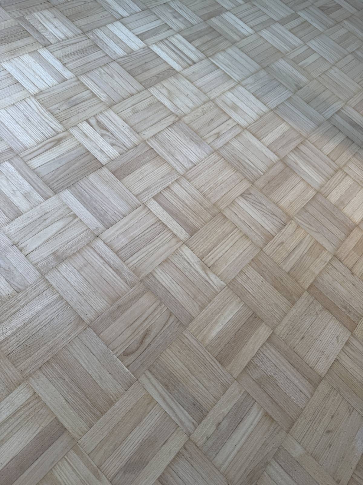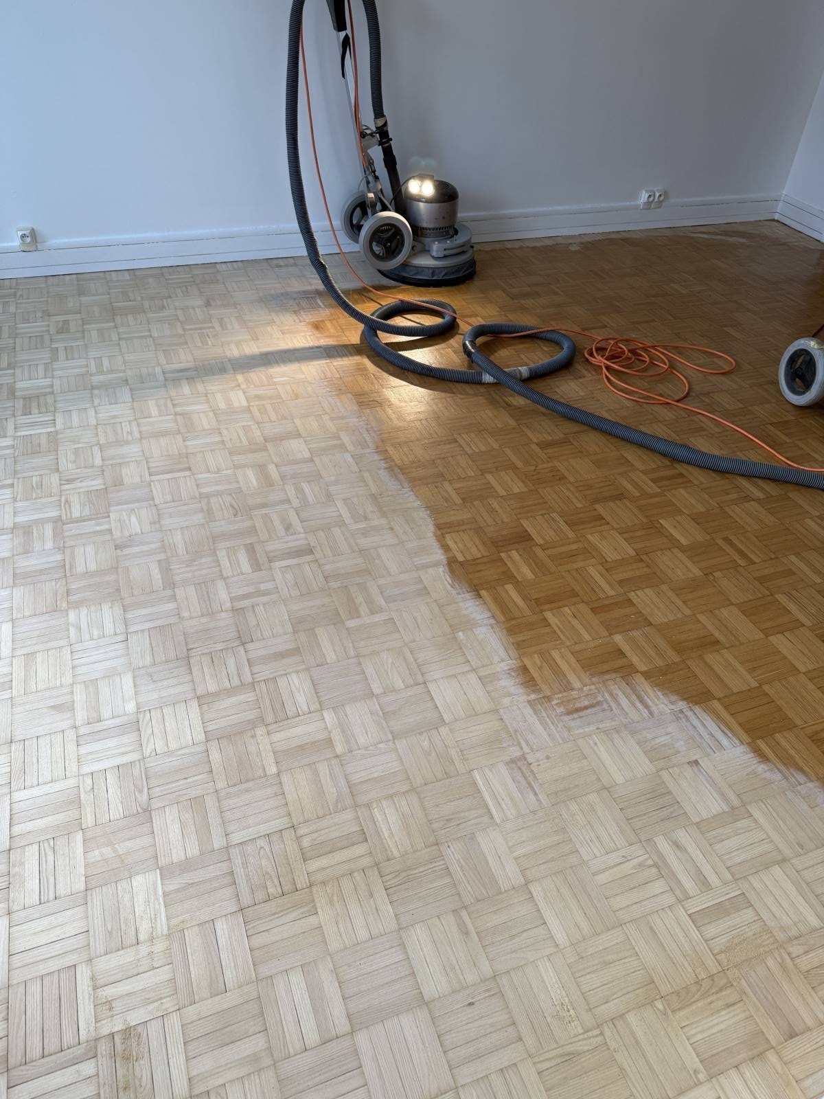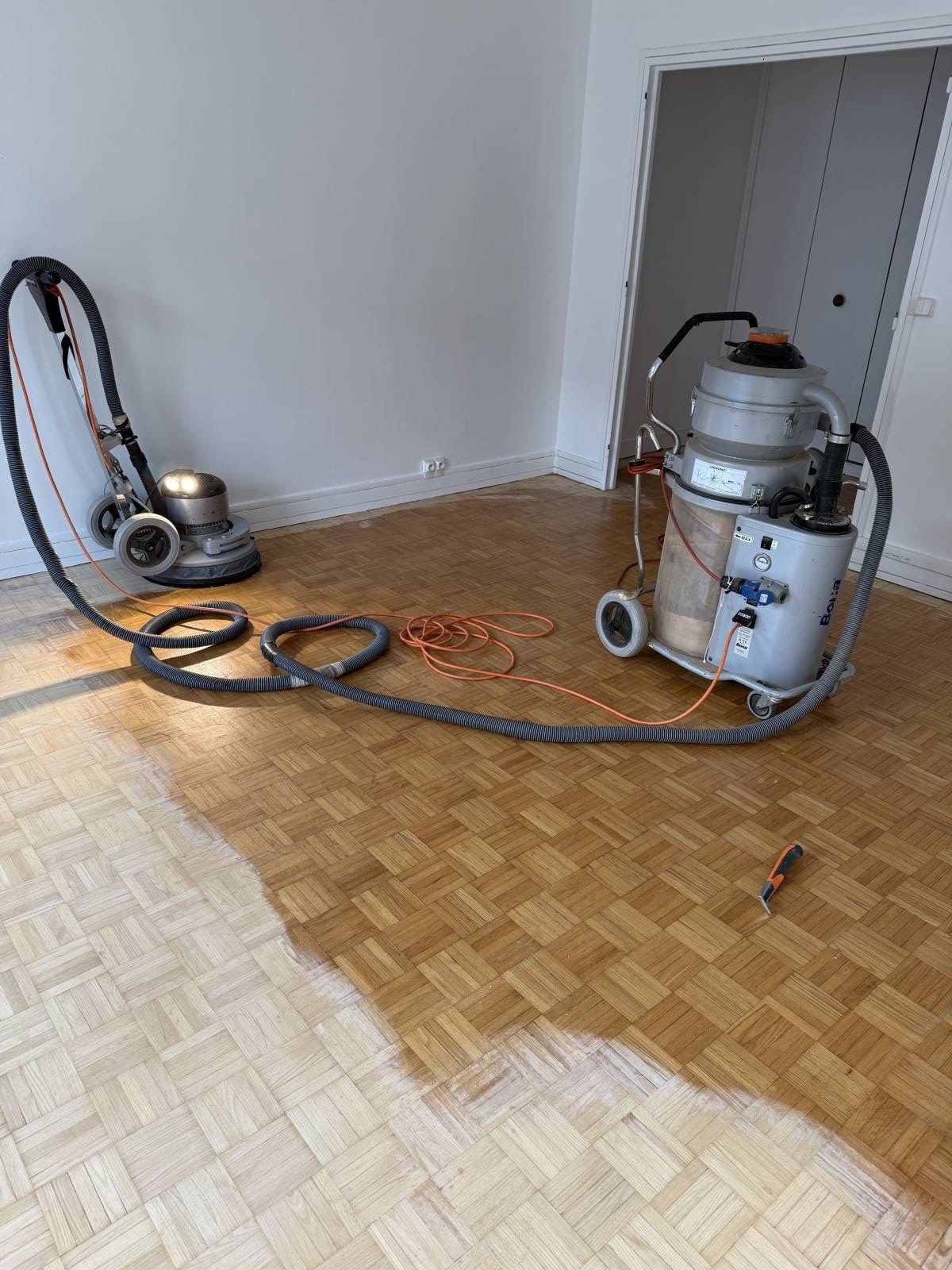 Le ponçage sans poussière repose sur l’utilisation d’aspirateurs industriels couplés aux machines, ce qui permet de travailler dans des intérieurs occupés sans gêner les résidents. Ce processus élimine les irrégularités, les rayures et les anciens vernis, tout en préservant l’intégrité du parquet mosaïque. La vitrification incolore mate, ici réalisée avec le produit Bona, protège le bois des chocs et des taches tout en conservant un aspect naturel et sobre.